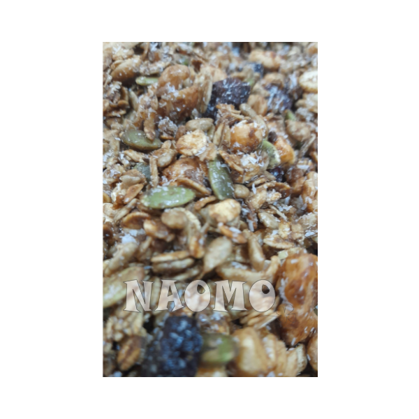 Ingredientes: avena - azucar mascabo - maní - nueces - semillas de girasol - semillas de zapallo - coco rallado - pasa de arandano - semillas de lino - aceite de coco - esencia de vainilla - sal marina